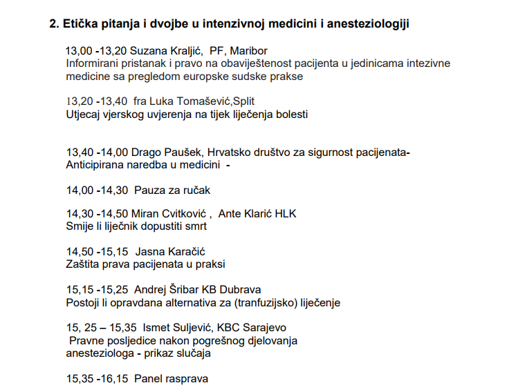 PRAVNI POLOŽAJ LIJEČNIKA U ETIČKIM IZAZOVIMA INTENZIVNE MEDICINE. Uz liječnike, sudjelovati će pravnici iz HLK-a, suci, teolozi, predstavnici vjerskih zajednica te predstavnici udruga za promicanje prava pacijenata. Teme će biti vezane uz primjenjivost smjernica u liječenju te njihov pravno obvezujući učinak, distribuciju odgovornosti između različitih struka koje liječe bolesnika, pristupu bolesniku u terminalnoj fazi maligne bolesti, vođenje davatelja organa i proglašavanje moždane smrti te kontroverze vezane uz transfuzijsko liječenje i vjerska uvjerenja. Simpozij bismo zaključili deklaracijom koja bi predstavljala službeni stav HDIM koji bi bio osnova za donošenje odluka u pravnim sporovima u budućnosti. HRVATSKA UDRUGA ZA PROMICANJE PRAVA PACIJENATA Zaštita prava pacijenata u praksi