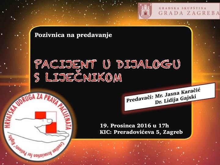 19. prosinca u “Kic-u “u Zagrebu je održano predavanje “Dijalog pacijenta s liječnikom ” pod pokroviteljstvom Gradske skupštine grada zagreba čiju temu su predstavile Dr. Lidija Gajski te predsjednica Udruge mr. Jasna Karačić. Istaknule su važnost komunikacije te sve prednosti dobrog odnosa liječnika i pacijenta u medicini.